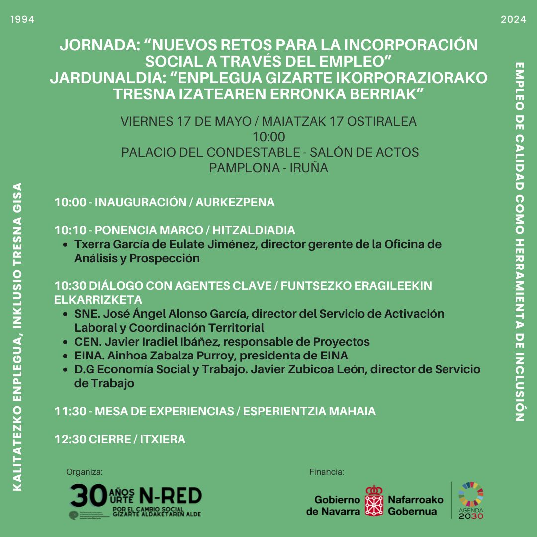 La Red Navarra de Lucha contra la Pobreza y la Exclusión Residencial organiza, con motivo de su proyecto anual «30 años por el cambio social / 30 urte gizarte aldaketaren alde», la jornada «nuevos retos para la incorporación social a través del empleo».