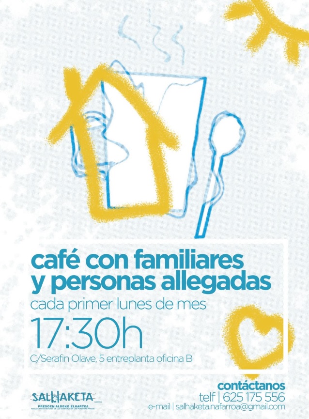 El próximo lunes 3 de noviembre Salhaketa Nafarroa organiza un encuentro para familiares y allegadas de personas presas/expresas. La intención es generar un espacio cálido y cómodo donde los y las participantes puedan expresar sus experiencias.