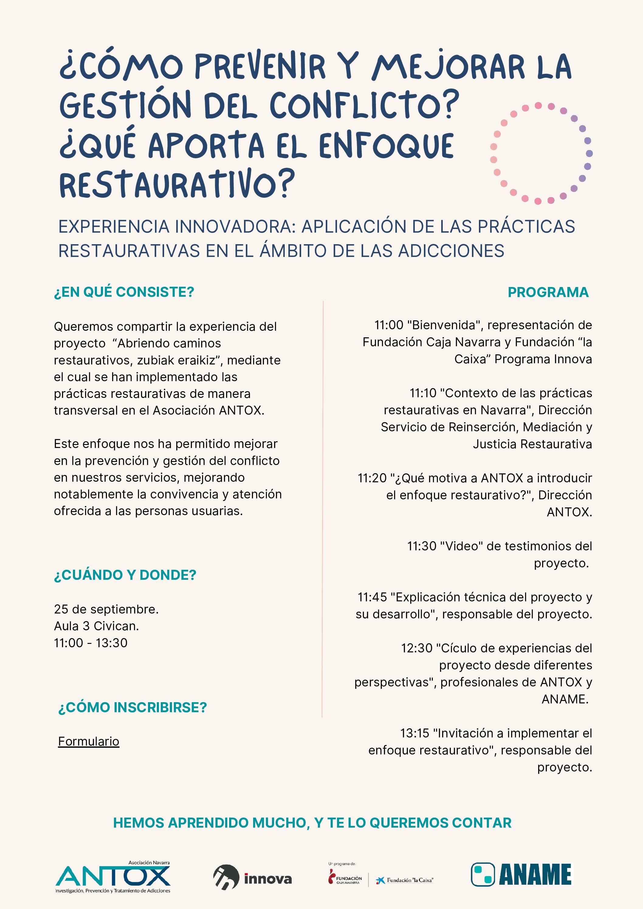 La Asociación Antox ha organizado «¿Cómo prevenir y mejorar la gestión del conflicto? ¿Qué aporta el enfoque restaurativo?», una experiencia innovadora sobre la aplicación de las prácticas restaurativas en el ámbito de las adicciones.