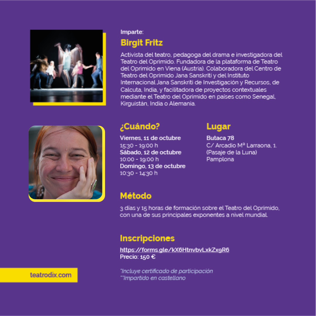 Teatrodix Phestibalen laugarren edizioak antzerki komunitarioko tailer trinko hau aurkezten du, non Birgit Fritz nazioarteko adituak zapalduaren antzerkiari buruz darabilen metodologia modu aktibo eta parte-hartzailean praktikan jarriko den.