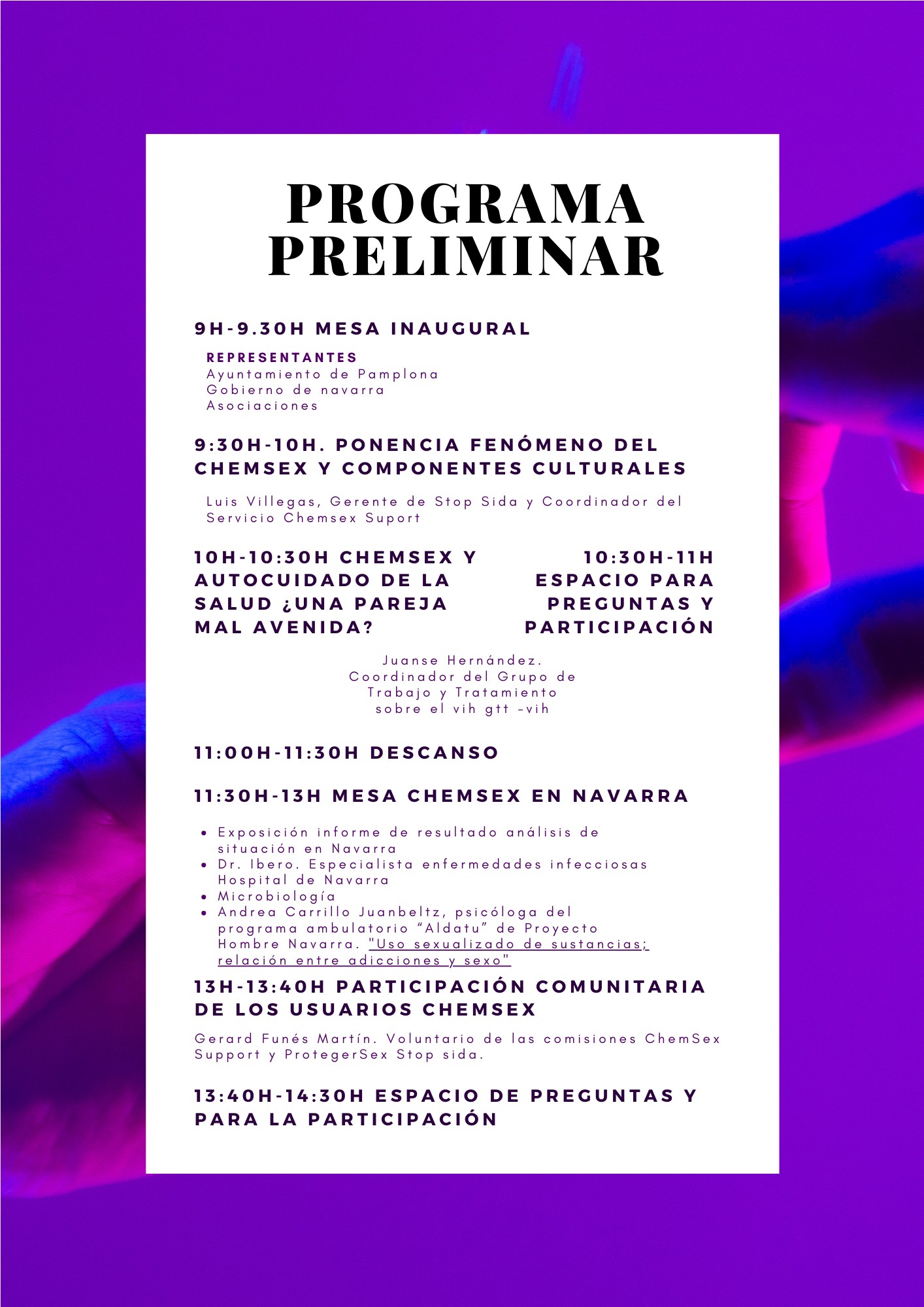 La jornada contará con profesionales de Stop Sida y Gtt, que aportarán su amplia trayectoria en el abordaje del Chemsex, y además aterrizarán a la situación actual en Navarra, con profesionales de la salud y expertos en drogas.