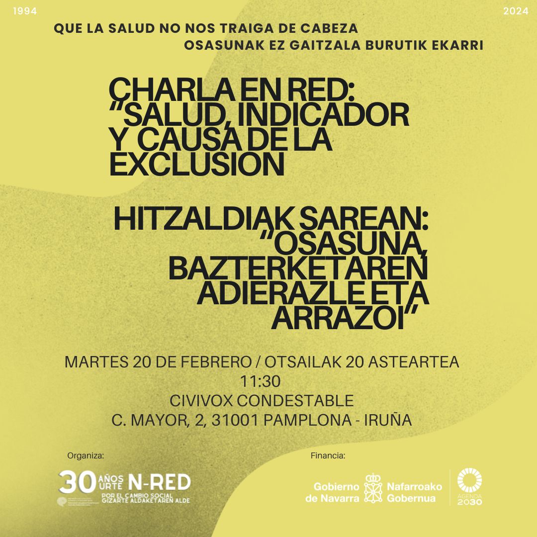 La charla en Red ‘Salud, indicador y causa de la exclusión’ se realizará el próximo martes 20 de febrero a las 11:30 horas en Condestable. C. Mayor, 2, 31001 Pamplona – Iruña.