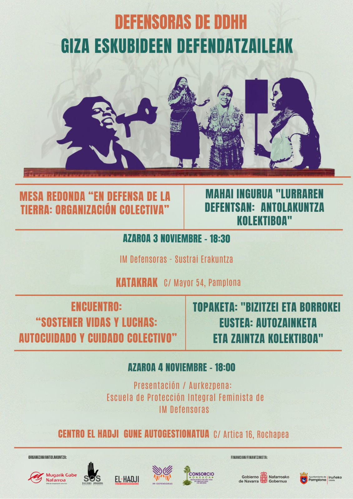 Sos Racismo Nafarroa, Mugarik Gabe Nafarroa, El Hadji, Im-Defensoras y Consorcio Oaxaca organizan las jornadas «Defensoras de Derechos Humanos».