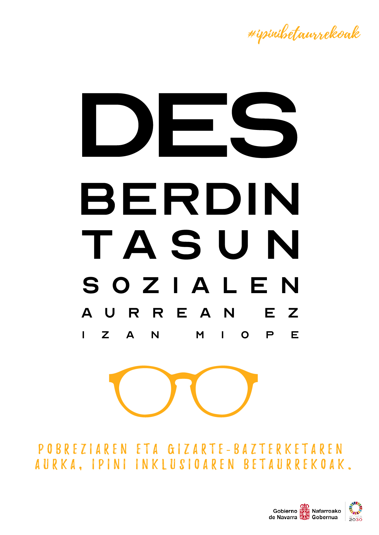#Ipinibetaurrekoak kanpaina optika askotan dauden irudiak imitatzen ditu, miopía edota bestelako begitako akatsak graduatzeko erabiltzen diren letrazko kartelak erabiltzen ditu. Kontzeptu horiekin jolasten du kanpaina “errealitatea hautemateko orduna aurreiritziak eta estereotipoak graduatzeko beharretik sortzen da kanpaina hau. Horregatik ikinlusioaren betaurrekoak ipintzera animatzen zaituztegu, errealitatea behatzera eta aztertzera lagunduko digutenak eta enpatía eta elkartasuna sustatuko dutenak. Behin jartzen dituzula ezingo duzu ondokoak bizi duena ez ikusi”.